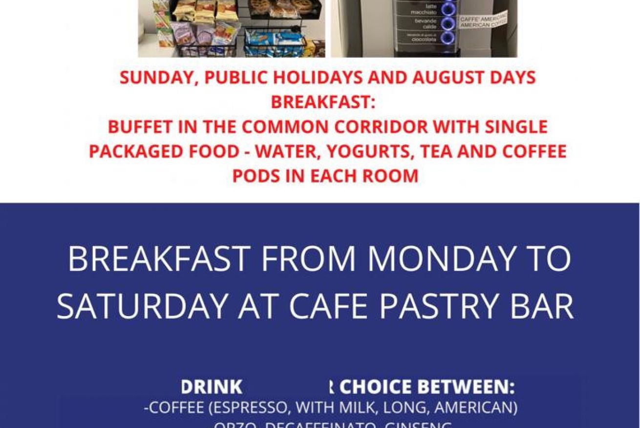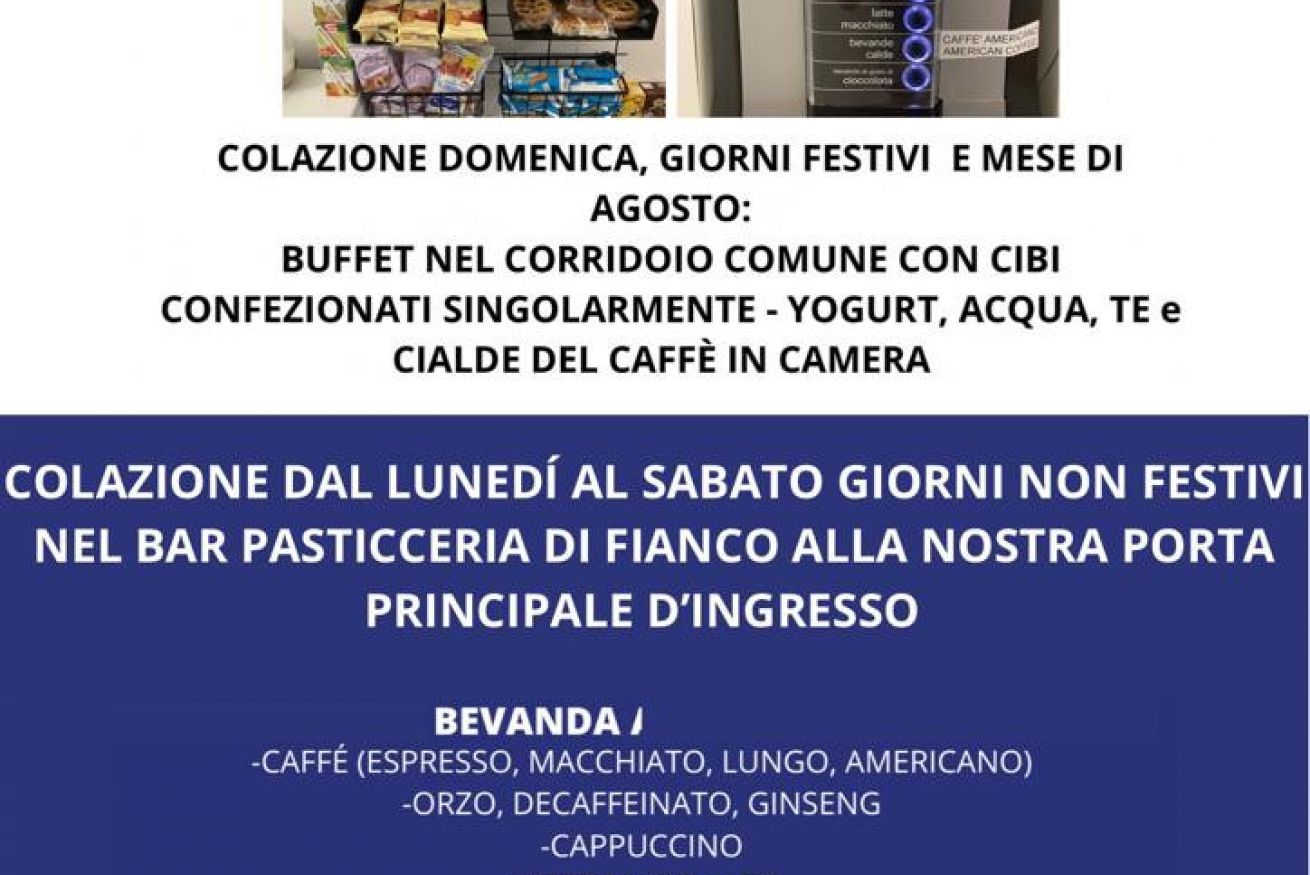 Dal lunedì al sabato, se compresa nella tariffa, colazione presso Bar-Pasticceria adiacente con cibo dolce e salato - Domenica, Festivi e nel mese di Agosto colazione self-service nel corridoio comune con cibo confezionato singolarmente.